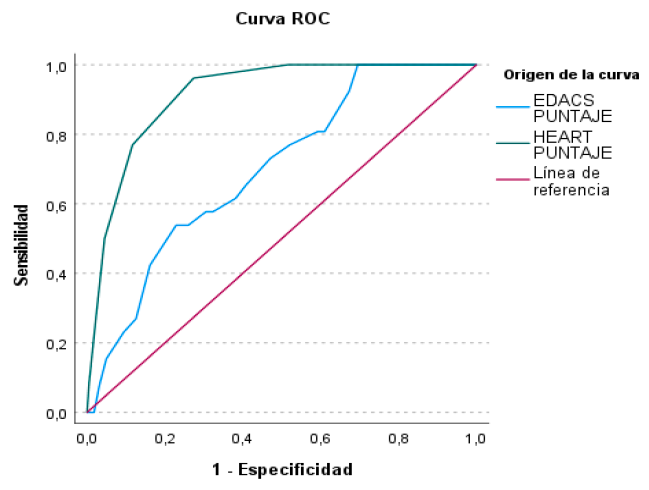 Objetivos. Comparar la capacidad de las escalas HEART y EDACS para la predicción de eventos adversos cardiovasculares mayores (MACE) a los 30 días de seguimiento en pacientes con dolor torácico agudo que acuden a un servicio de emergencia. Materiales y métodos. Estudio retrospectivo en mayores de 18 años atendidos por dolor torácico agudo, excluyendo síndrome coronario agudo (SCA) con elevación del ST, traumatismos e infecciones. Se evaluaron las escalas HEART y EDACS al ingreso. Se calculó el área bajo la curva (ABC) de características operativas del receptor (ROC), sensibilidad, especificidad, valor predictivo positivo y valor predictivo negativo de ambas escalas en la predicción de MACE a 30 días. Resultados. Se evaluó 249 pacientes, 62,2% varones, edad promedio 66,5 años. Se encontraron 25 MACEs (10%). La escala HEART clasificó a los pacientes en riesgo bajo (43,4%), moderado (47,4%) y alto (9,2%). Con la escala EDACS se encontró pacientes de bajo riesgo (38,6%) y no bajo riesgo (61,4%). En relación a los MACE, la escala HEART tuvo un ABC de 0,91 (IC 95%: 0,87 – 0,95) y el EDACS de 0,7 (IC 95%: 0,60 – 0,79). Para el diagnóstico de SCA, la escala HEART tuvo un ABC de 0,85 (IC95%:0,78 – 0,92) y el EDACS 0,64 (IC95%: 0,55 – 0,72). La escala HEART obtuvo mejor rendimiento que EDACS, especialmente cuando se obtuvo un puntaje >=4. Conclusiones. La escala HEART tiene mayor rendimiento diagnóstico que EDACS para predecir MACE en pacientes con dolor torácico agudo que acuden a un servicio de emergencia.